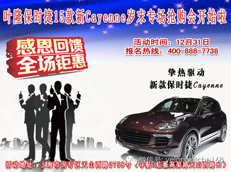 2014年12月(yuè)31日,“葉隆汽車保時(shí)捷15款新卡宴歲末專場(chǎng)搶購(gòu)會”報名開始啦,本次活動葉隆汽車共有30台卡宴參加搶購(gòu)活動,現場(chǎng)訂車優惠力度前所未有,超越團購(gòu)價,還(hái)有2萬精品豪禮相送,精彩航程等你來(lái)參與,活動僅限三個(gè)小時(shí)!要買車過年的(de)朋友們趕緊來(lái)報名參加吧!
