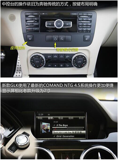 新款GLK配備最新型COMAND NTG 4.5駕駛室管理(lǐ)及數據系統,兼容LINGUATRONIC中文多(duō)媒體語音(yīn)控制系統,帶有高(gāo)清色彩顯示屏的(de)17.8厘米快(kuài)速硬盤導航、COMAND APS可(kě)播放MP3/WMA/AAC多(duō)種格式的(de)數字音(yīn)樂(yuè);免提電話(huà)可(kě)通(tōng)過藍牙接口播放音(yīn)樂(yuè)和(hé)顯示文本信息;車載媒體接口則用(yòng)于連接MP3 播放器/iPod 或USB 存儲器等各種設備。