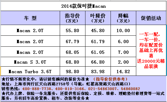 近日,葉隆保時(shí)捷中心新到一批保時(shí)捷Macan S現車,奢華耀目小卡宴好性能,中型SUV高(gāo)性價比全線秒殺,購(gòu)車享保稅區(qū)港口最低成交價,配置豐富手續齊全,顔色和(hé)配置多(duō)選,欲購(gòu)從速,并送大(dà)禮包;對(duì)該車感興趣的(de)朋友可(kě)以到店(diàn)詳談或咨詢,購(gòu)車咨詢電話(huà):400-888-7738 優惠詳情參見下(xià)表: