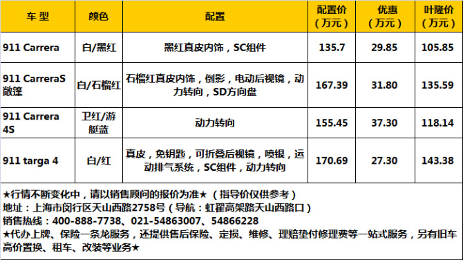 近日,編輯從上海葉隆之信保時(shí)捷中心了(le)解到,保時(shí)捷911最高(gāo)降37.3萬,另送豪華精美(měi)裝潢,到店(diàn)詳談還(hái)有更多(duō)優惠,有意向的(de)朋友可(kě)打電話(huà)詳細咨詢。