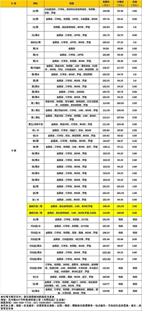 Cayenne 現車充足,一車一配,一車一價,近僅90.98萬起,同時(shí)贈送價值20000元的(de)大(dà)禮包。即日在上海葉隆購(gòu)車可(kě)享夏日金融政策:最低可(kě)零首付,低利率僅4-4.5個(gè)點,快(kuài)速貸款僅需3-5個(gè)工作日,還(hái)送車價、保險、購(gòu)置稅、上海大(dà)牌!一切以到店(diàn)咨詢爲準!感興趣的(de)朋友不妨撥打咨詢熱(rè)線400-888-7738或到店(diàn)咨詢。